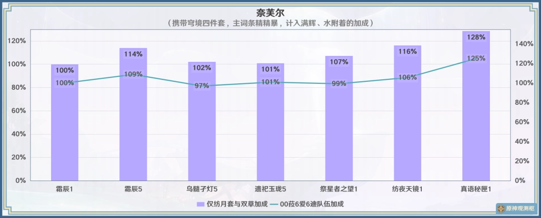 • 霜辰在精1时表现接近精5乌髓孑灯,在精通与反应加成较高的队伍中可能略高,精5时有约10%的提升。