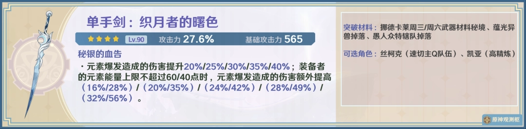 3.3. 对于神里绫华、刻晴与行秋,织月者的曙色在一些情况下可以作为选项,但相对同精炼的狼牙以及精5海渊终曲、黎明神剑不一定更优,性价比低。