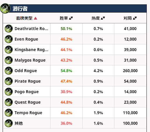 而关于盗贼的话,天梯上目前流行的玩法无外乎几种,从刚刚结束的黄金赛上的套牌卡组来看,奇数贼依然占有很大的比例。虽然等级提升被砍,从胜率上我们也能看出,54.8%的胜率依然让奇数贼在天梯上有着一战之力。