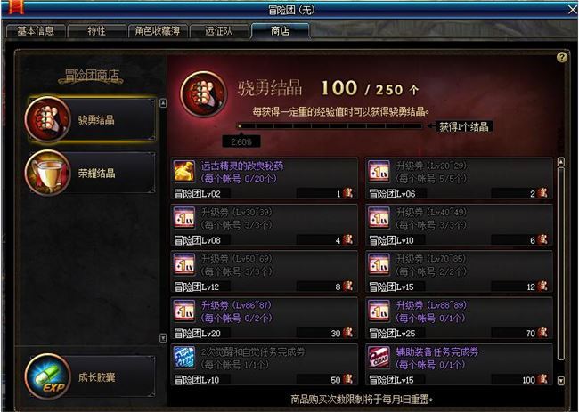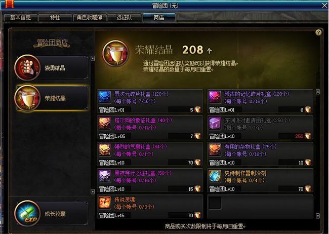 第一种材料骁勇结晶只有升级部分发生了变化。远古精灵的改良秘药10→20,86级升级券删除,加入86-87级升级券2个费用30个结晶,加入88- 89 级升级券1个费用70个结晶。第二种材料荣耀结晶。加入了两种新的可兑换物50个英雄的证明(400个材料可以兑换一件95传说)月上限16个费用是15个结晶,还有就是25个可用的杂物月上限16个(700个可以兑换一件95传说武器)费用是10个结晶。