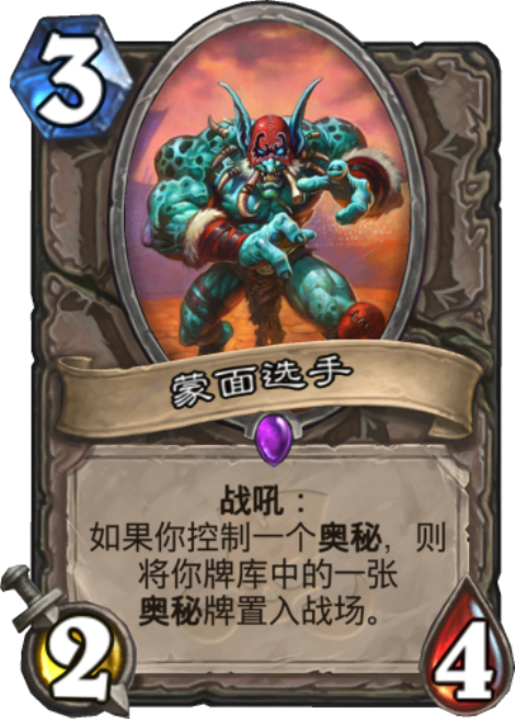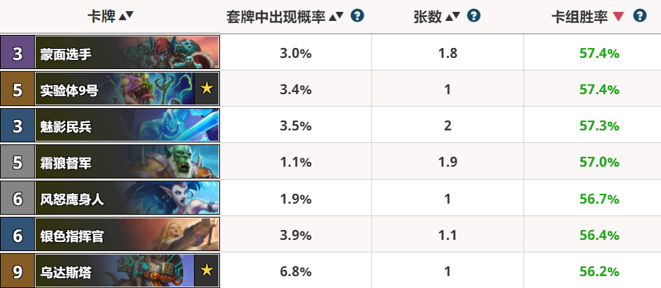 排名第1的也是奥秘猎体系的神卡,低费好配合,发动一次效果就赚了,由于这2张卡也是基本只用在奥秘猎卡组中,所以比起那些在什么卡组中都要插一脚的卡来说,胜率反而更高一些。