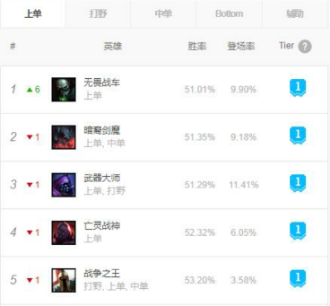 现在上单英雄大多以重装战士 和坦克为主,从胜率上来看以厄加特、剑魔、贾克斯为首的战士均在榜单前列,但锐雯的胜率也并不低。