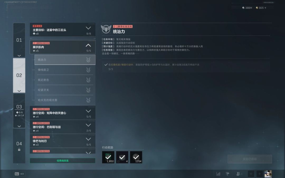 1、任务目标:在任意机密/绝密行动中,装备防护等级≥5的护甲与头盔时,累计击败3名敌方特战干员