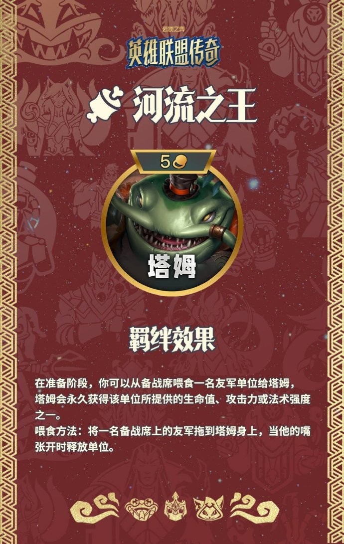 在准备阶段,你可以从备战席喂食一名友军单位给塔姆,塔姆会永久获得该单位所提供的生命值、攻击力或法术强度之ー。