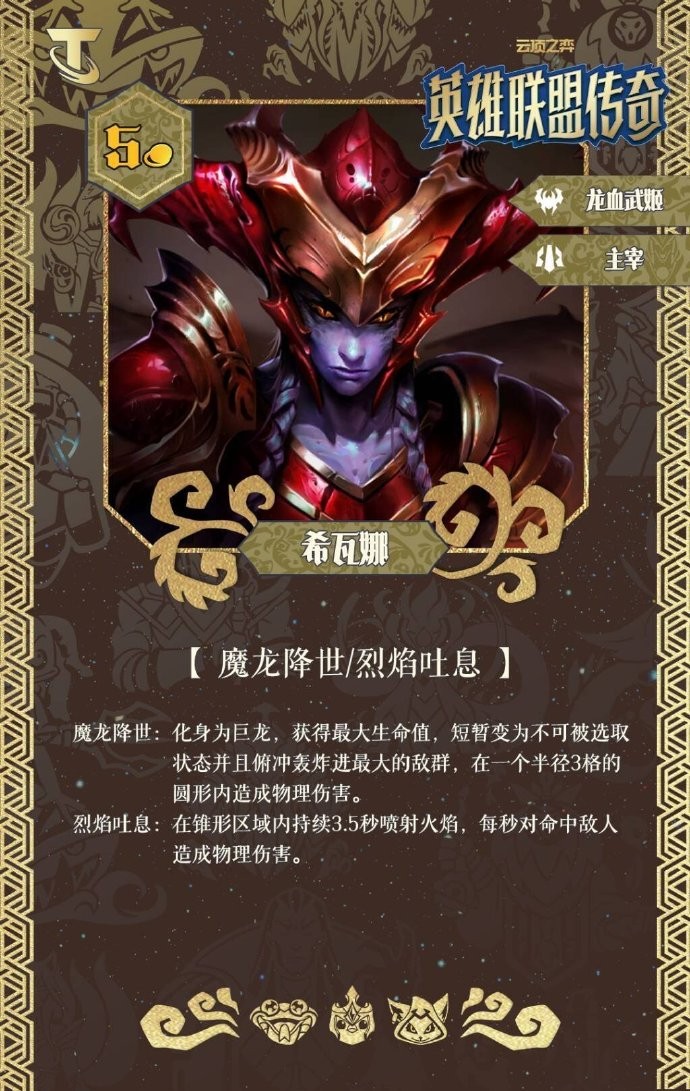 魔龙降世:化身为巨龙,获得最大生命值,短暂变为不可被选取状态并且俯冲轰炸进最大的敌群,在一个半径3格的圆形内造成物理伤害。