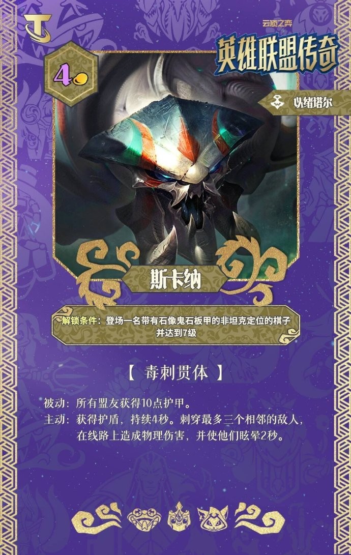 云顶之弈S16版本英雄联盟传奇主题PBE美测服更新了,在新赛季会增加很多新的羁绊和棋子,还有不少老羁绊,老英雄的回归,那么有不少小伙伴好奇各个英雄的技能是什么,下面就给大家带来s16斯卡纳羁绊效果一览。