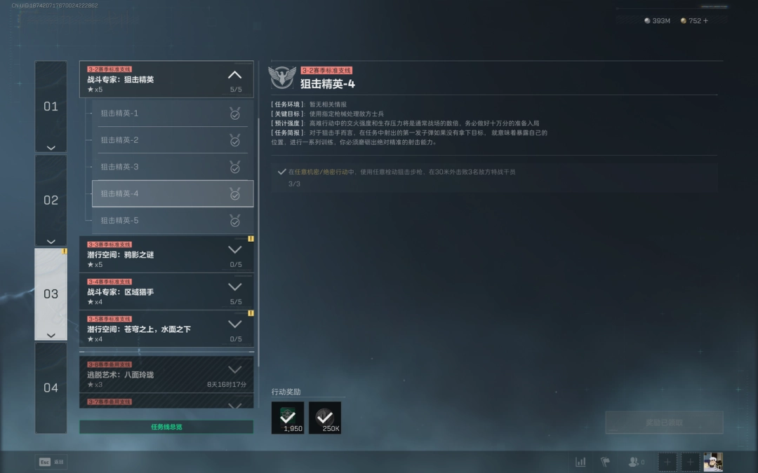 1、任务目标:在任意机密/绝密行动中,使用任意栓动狙击步枪,在30米外击败3名敌方特战干员