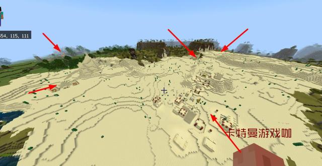 我们在坐标位置:654.115.111的位置,发现了许多的景点建筑,三个村庄和2个沙漠神殿,看起起来出生点有太多的东西让我们探索了。