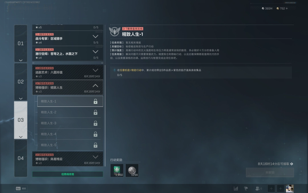 1、任务目标:在任意机密/绝密行动中,累计成功带出5件品质≥紫色的医疗道具类收集品