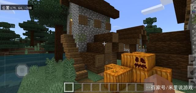 村里的房子建筑都是蛮独特的,还有堆积了很多南瓜和南瓜头盔,南瓜头盔可以收集起来,要是遇到小黑就派上用场了。