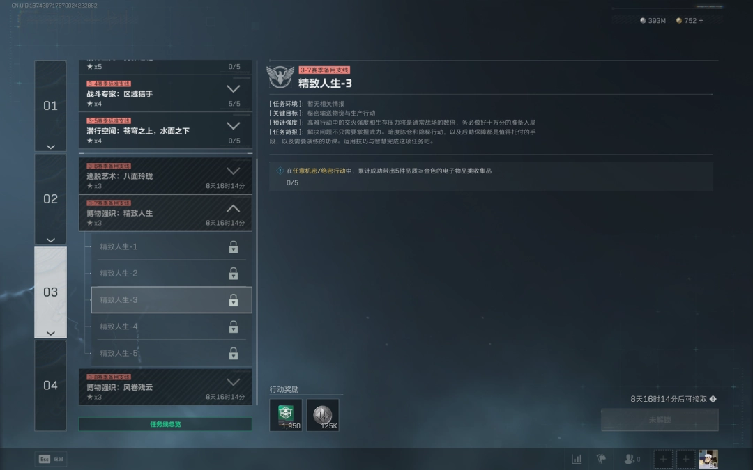 1、任务目标:在任意机密/绝密行动中,累计成功带出5件品质≥金色的电子物品类收集品