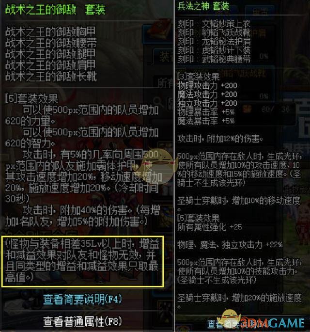兵法之神三件套拥有200点三攻和5%双暴,12%的白字,且能给队友增加10%的攻击移动速度,和15%的施放速度光环,五件套则提供自身25点的全属性强化,22%的三攻,且给队友曾建华10%的技能攻击力光环。