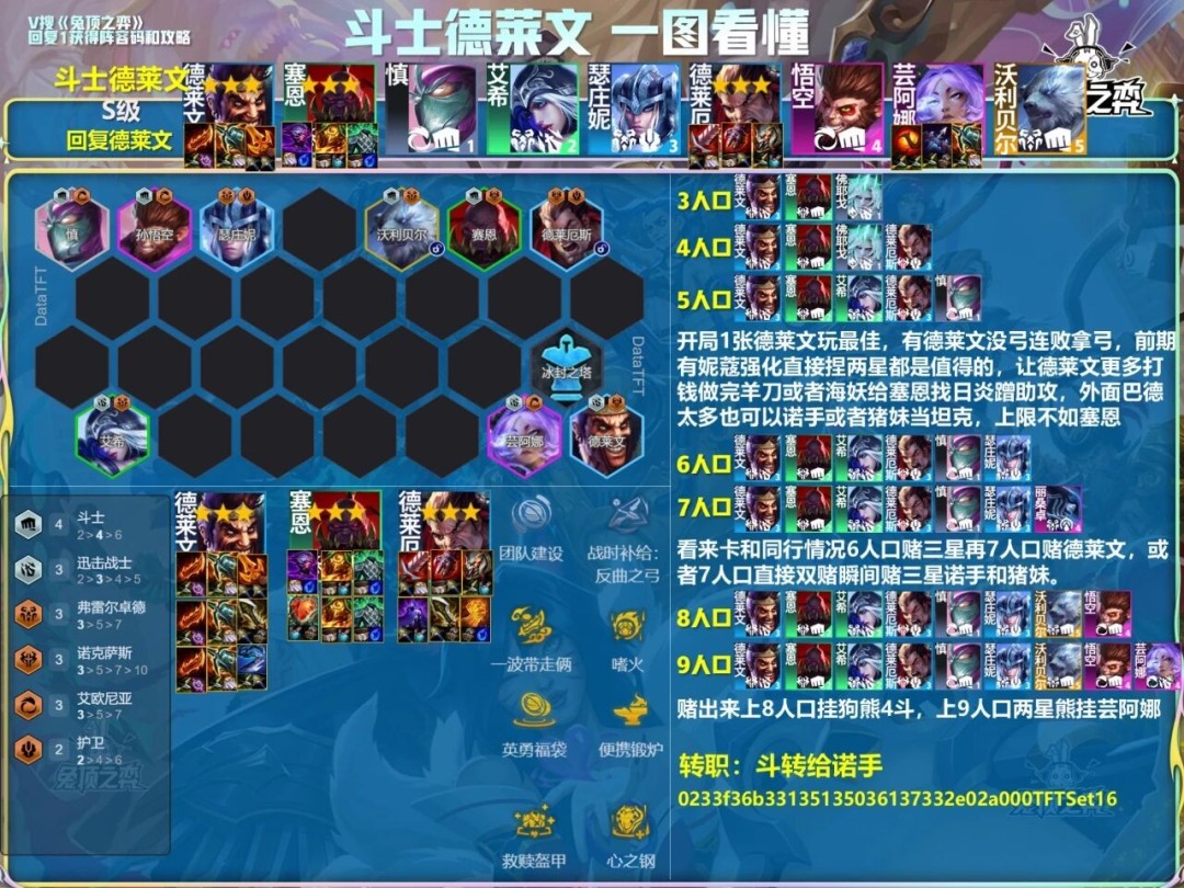 云顶之弈S16版本英雄联盟传奇主题,在新赛季会增加很多新的羁绊和棋子,还有不少老羁绊,老英雄的回归,那么有不少小伙伴好奇新赛季有什么强力阵容,下面就给大家带来s16斗士德莱文阵容推荐。