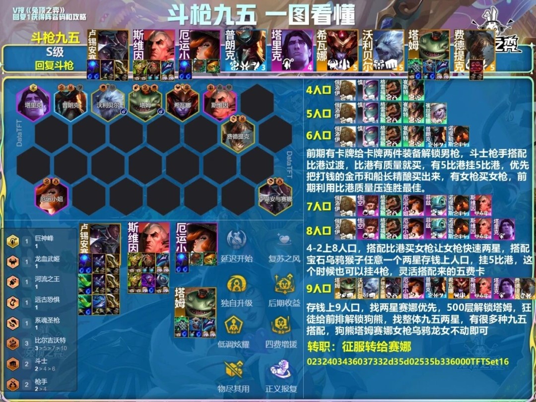 云顶之弈S16版本英雄联盟传奇主题,在新赛季会增加很多新的羁绊和棋子,还有不少老羁绊,老英雄的回归,那么有不少小伙伴好奇新赛季有什么强力阵容,下面就给大家带来s16斗枪九五阵容推荐。