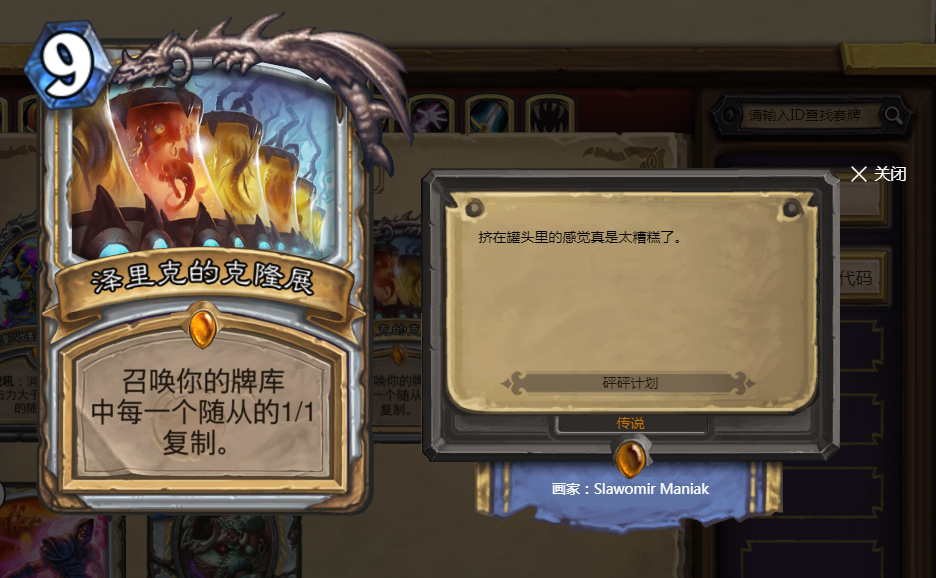9费将牌库里的随从拉一个11的复制出来,性价比尚可,尤其是如果你偏好玩后期的牧师。目前大家最熟悉的剧情应该是利用这一张橙卡召唤出了蓝龙,维纶外加黑曜石守护者等,或者是奇利亚斯,最后再通过各种手段复活,以打出一波AOE的效果?