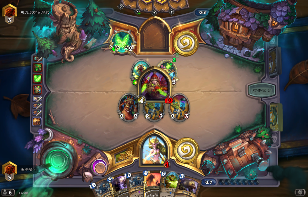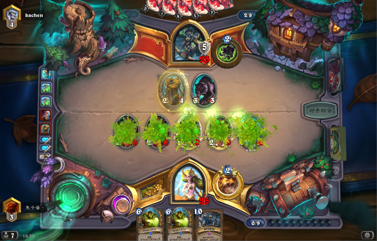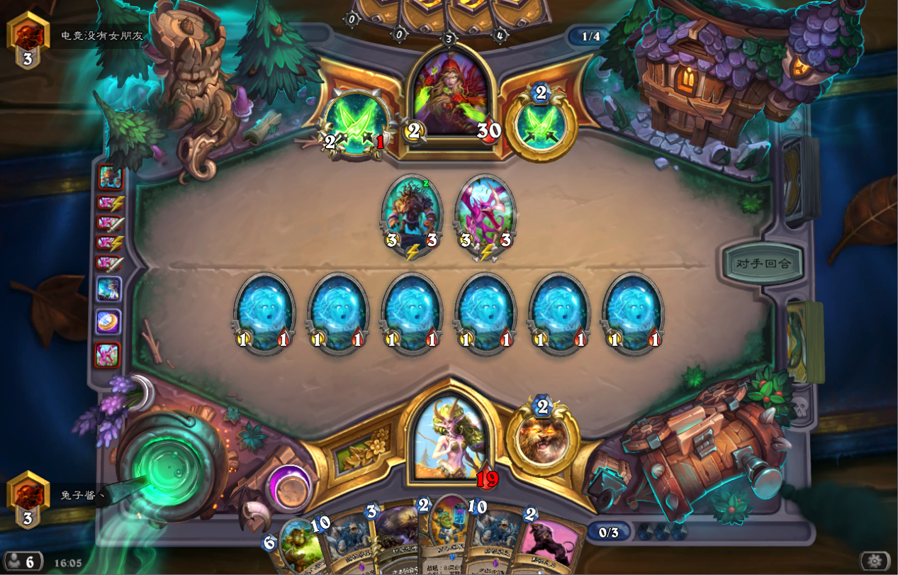 或者我用野性之力buff后用脸解雏龙,对面只剩下20血+2个怪,如果再和我拼脸,下回合我咆哮必能斩杀。此时对面失去雏龙基本无法斩杀我。