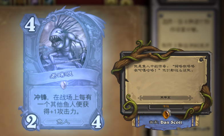 目前已经进入荣誉室了,而在过去他是一张免费获得的传说随从,只要你拥有了所有的鱼人随从,那么你就可以拥有他。冲锋属性,场上每有一个鱼人,就增加一点攻击力。在鱼人玩法成为版本主流时,这张卡牌也曾经有着一战之力。还记得当时蓝色冲锋鱼搭配老瞎眼打出的那一套逆天斩杀么。