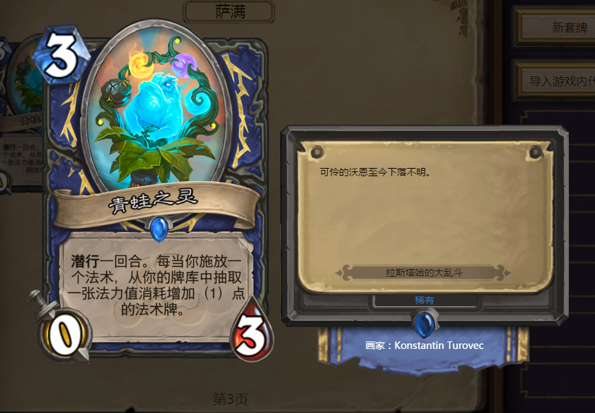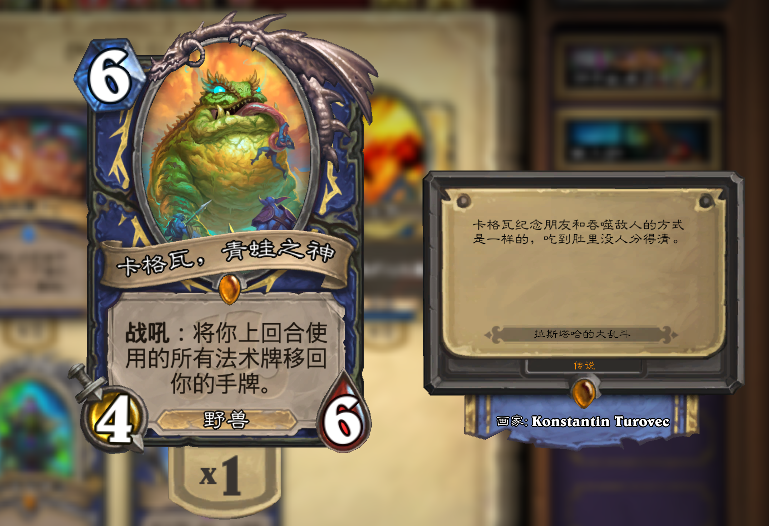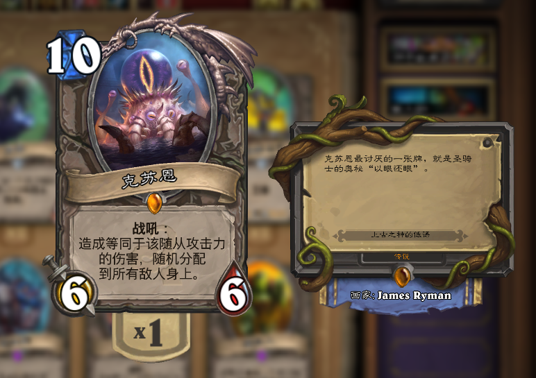 上古之神低语的版本里免费赠送的传说随从,在当时,也因为克苏恩的出现,曾经短暂引领过克苏恩玩法的趋势。虽然设计师的初衷是美好的,但是因为克苏恩的玩法有比较大的局限性,所以也只能是昙花一现之后,就消失在大家的视野之中,如今已经没有了声音。