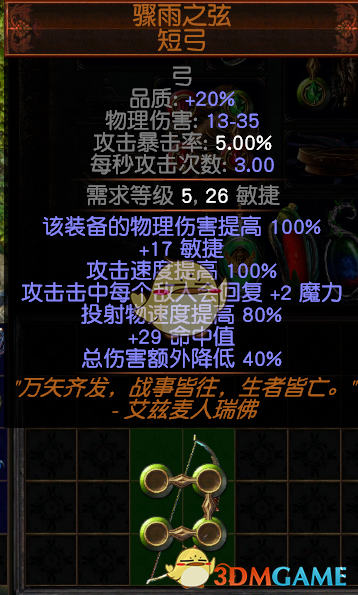 它和一般的弓类技能不同,几乎不受到弓本身的攻击力影响的,它的主要伤害来源是毒箭落地后产生的腐蚀地板和之后的孢子爆炸伤害。所以需要的词缀是:攻击速度,持续伤害,投射物伤害,混沌伤害。