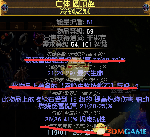 4.头盔:选择【裂界底子】的带【提高燃烧伤害】的稀有头盔,带一条抗性,最好还有生命。如图所示:我这个生命属实辣鸡了点,但是能用了。10C买的。