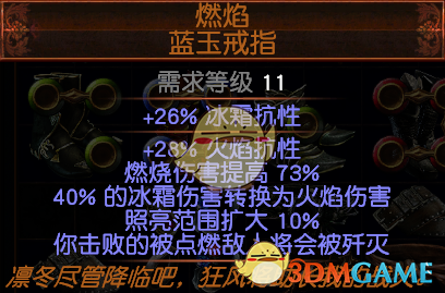 3.戒指:绑定两个燃焰戒指,提供大量燃烧伤,两个加一起等于一个女王杖了,很厉害。还能补冰霜和火焰抗性,实用。也是C货。