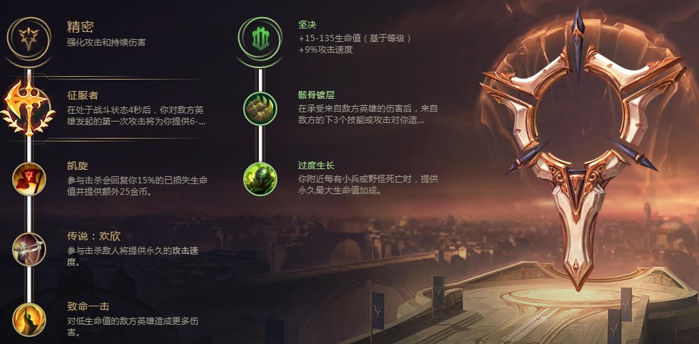符文方面可以主精密副坚决。精密系点征服者、凯旋、欢欣和致命一击,坚决系点骸骨镀层和过度生长,符文碎片选择1攻速1护甲和1法抗。