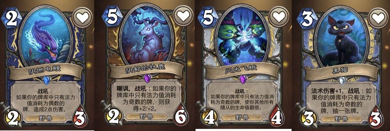 洛阿神灵。好吧,其实这个我认为也不能算特别的机制,毕竟只是单纯地给每个职业增加一张橙卡,骗氪而已。整个资料片大部分卡牌都是围绕各自洛阿神灵和动物之灵来展开的,例如法师的火冲强化,猎人的野兽铺场,德鲁伊的口咬,还有术士的弃牌(2333)。