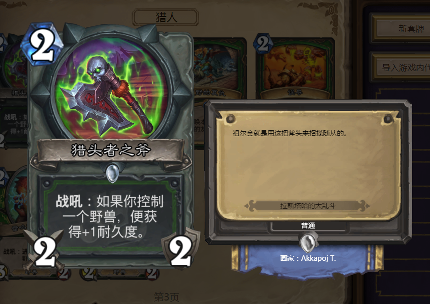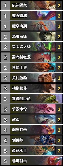 除了射箭之外新版本猎人又一个比较持续的输出手段,因为我们的卡组中加入了很多的野兽,使得这张卡牌可以获得极大的收益。为什么奇数贼强,是因为2费2/2的武器,我们的武器在2费还可能出现2/3或者2/4,我就问你强还是不强?