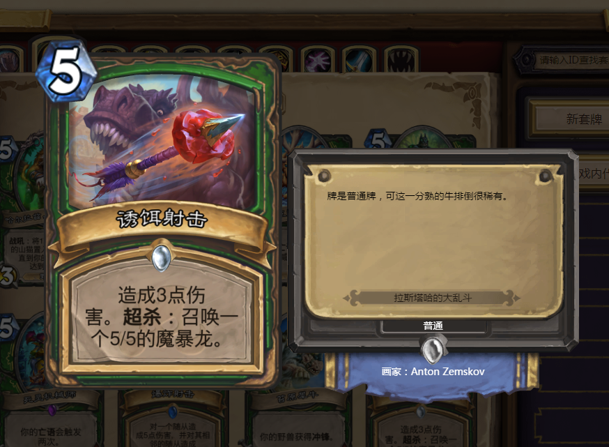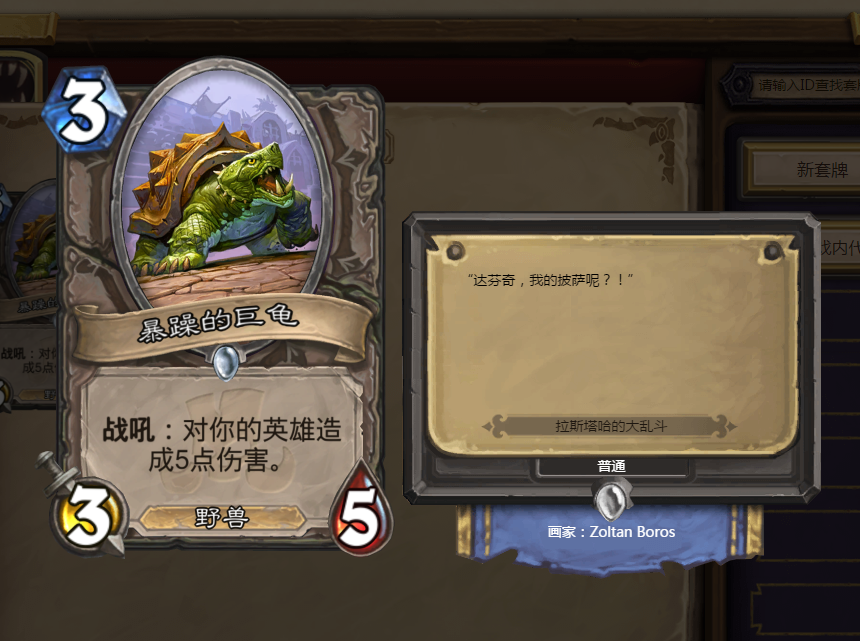 果然很暴躁,生起气来连自己都打。但身材上绝对没话说,3费3/5简直完美而且还是野兽属性,3费巨龟4费驯兽师直接一个5-7的嘲讽巨龟,你要怎么解?这么一想虽说掉了5血作为代价但实际上能获得的收益远远不止这5点,不过带一张足矣。