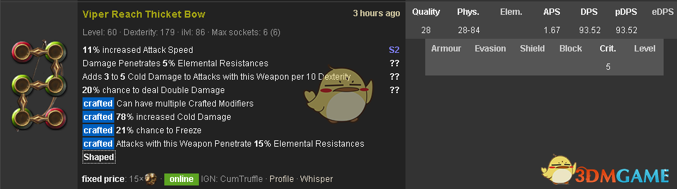 像这样一把武器trade上已经有很多了,有精力可以选择自己洗,找解锁过大师附魔的朋友帮忙附魔,或者像我一样直接买成品,目前在用的武器在赛季初很早2E淘到的,没有多大师的好,但是该有的词缀也都有,还是那句话,投入多大,伤害提升就多大