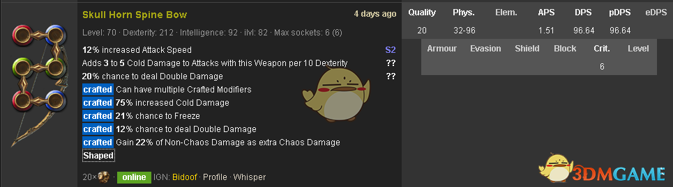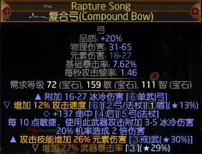武器选择塑界底子的黄弓,优先攻速较快的,或者自带攻击技能元素伤的底子,必要词缀:“每 10 点敏捷可使该武器的攻击附加(2–3)-(4–5)基础冰霜伤害”以及“攻击速度提高(11–12)%有20% 几率造成双倍伤害”