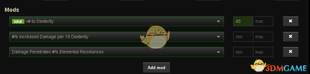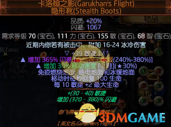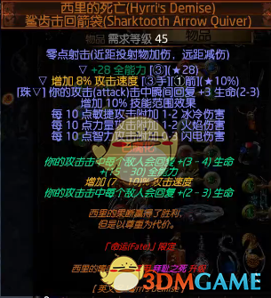 选用塑界底子,核心词缀:“每 15 点敏捷可使伤害提高1%” 其他词缀:“所有属性提高(10–12)%”、“伤害穿透(8–10)% 火焰、冰霜、闪电抗性”、高生命、爆伤、高敏捷、抗性、攻击元素伤等,以上词缀都有的话伤害提升非常可观,但是投入也非常大,有财力的朋友可以自己洗或者慢慢淘