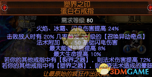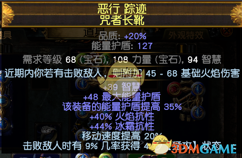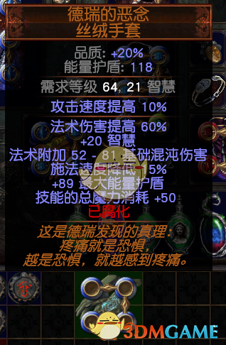 核心装备。为了让旋风斩的耗蓝达到100以上,触发头盔效果。必须带这个手套。缺点是护盾有点少。看在大量伤害的份上,就饶GGG策划一命吧?(有条件的瓦出+攻速最好。)
