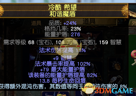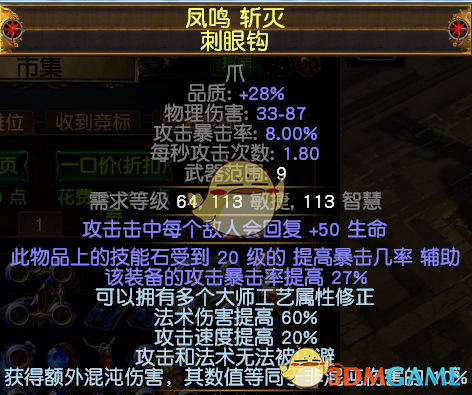 武器:绑定多大师必中匕首一把,这个我就不说有没有条件了。有没有条件都要来一个 (非混沌伤害的额外混沌伤害法术伤害+额外混沌伤害 攻击和法术无法被闪避 攻击速度 武器暴击率 多大师)
