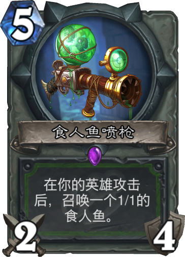 猎人的武器其实大多数都还不错,蜡烛弓啊鹰角弓啊都能在相关卡的卡组中发挥出应有的作用,哪怕是角斗士的长弓,在竞技场也有很不错的表现。但是,唯独我们的五费史诗武器食人鱼喷枪,却像一把生了锈连子弹都射不出的水枪一样,永远的呆在角落,五费两点的攻击,只能用来补补刀,杀个图腾都费劲,虽然可以召唤出来食人鱼,但是1-1的身材显得有点弱鸡,开卡包开到的话,还是尽快分解的比较好。