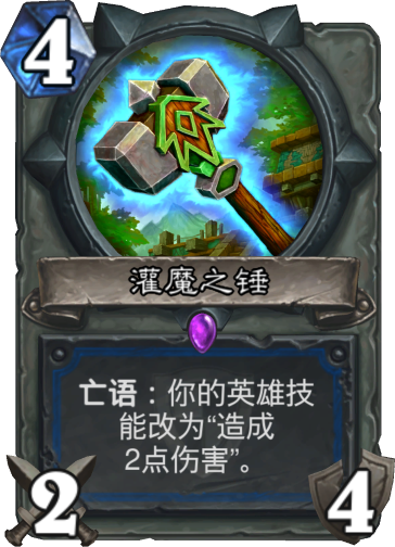 我想不是老玩家都没看到过这把萨满的四费武器吧,不仅年代久远,而且出场率几乎为零,没有谁会将它放到自己的卡组中,除非你根本不想赢。灌魔之锤是一把四费武器,却只有两点的攻击,只能用来补补刀,最特殊的是亡语效果,可以使得萨满的英雄技能变为二费打二,粗看还不错,其实呢,见效太慢,四费上武器一回合砍一刀,最快七费结束,触发亡语,这还是最理想的状态,再加上萨满没有与其相匹配的卡组构建,光靠二费打二的英雄技能,根本成不了事。