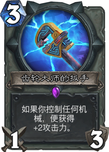 地精大战侏儒跟砰砰计划一样,都是以机械随从为主题,并且每个职业都有适合自身的机械卡组,比如我们的潜行者就有着非常不错的三费钢铁武道家,可惜的是,跟机械有关的史诗武器齿轮大师的扳手却显得有点垃圾了。首先,三费1-3的属性,还不如圣骑士的一费小榔头圣光的正义,连补刀都吃力,虽然控制机械随从可以+2攻击,但是上限也就一把3-3的武器,要求还那么多,上限一般下限低又有什么用呢?