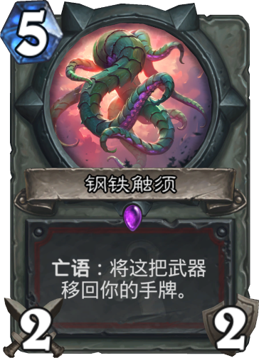 如果你问我炉石传说中哪怕武器最垃圾,我肯定投票给战士的五费史诗武器钢铁触须。一把高达五费的武器,却只有2-2的属性,简直搞笑,还是那句老话,只能用来补补刀,两点的耐久又显得有点捉急,根本不经用。虽然呢,这把武器的亡语可以移回手牌,说得明白点就是无限使用,但是,你每次浪费五点法力值就为了多出两点伤害,你确定有用吗?有这么多法力值我还不如上个大哥呢。