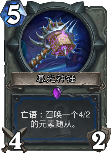 萨满虽然也有武器,但是质量实在有点让人看不下去,也就愤怒之锤,青玉之爪以及未削弱前的幽灵之爪登场率高一点,其他的就比较悲剧了。暮光神锤是一把四攻两耐久的五费武器,亡语的话可以召唤一个4-2的元素随从,其实呢,这把武器性价比还算可以,没有想象中那么糟糕,只是萨满没有适合这把武器的体系,五费的话还有更适合的愤怒之锤,所以呢,暮光神锤就比较悲剧了。