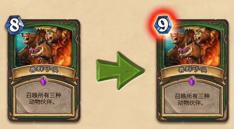 猎人以前同样是快攻卡组为主,这时候,兽群呼唤的出现让猎人有了新的道路,那就是中速猎,并不完全需要前7回合打死对手了,因为8费开始才是猎人最强的时候,没有什么是一个三宝解决不了的,如果有,那就再来一次,看上去这个削弱只是从8费变成9费,但让相关卡组的配合少了很多,中速猎也等了好几个版本才缓过气来。