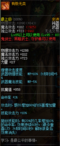 钝器,如果在没有泰波尔斯武器和圣耀武器的情况下,刚好出了这把武器。那不妨可以先拿着过渡一下。在身上黄字不那么多的情况下,这把武器的提升还是很客观的。理想提升率是还要比圣耀高上一点的,但是考虑到属性递减,实际效果就是会比圣耀差一些,但总比自制SS和荒古好的多。
