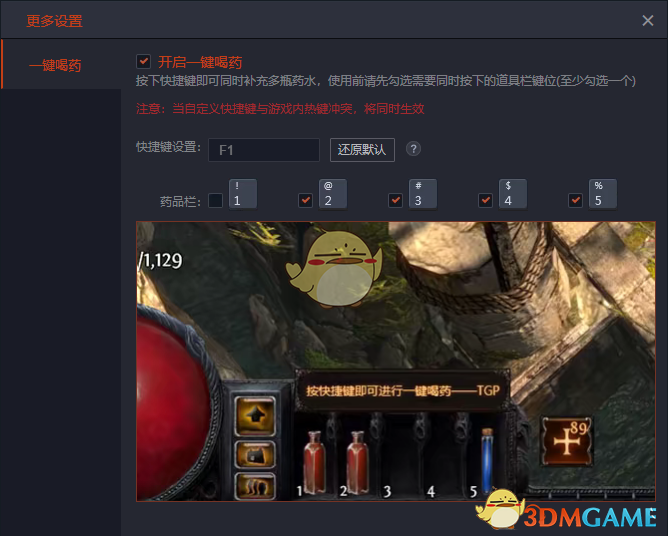 不要盲目使用一键喝药,哪怕要用的话,记得把1号键的药剂取消,平时跑路不需要用到。