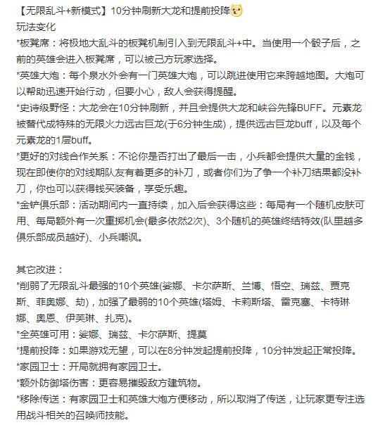 除此之外,最值得一提的还是大龙和远古巨龙的改变。大龙在10分钟就会刷新,同时元素龙将会被特殊的远古巨龙代替,并且在6分钟就会生存,看来前期将会打得更加激烈了啊。说起来这次无限乱斗的改动真的不小,当然应该还是不会让人失望的。