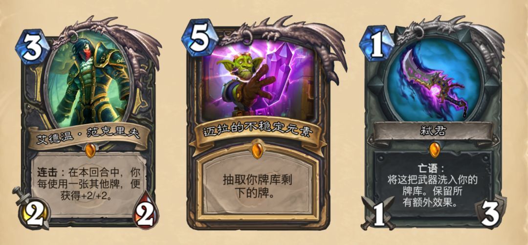 2、迈拉的不稳定元素:过空牌库的特性令一向缺牌的盗贼拥有了补牌能力,在节奏型盗贼中有着十分不错的效果,而且到明年的4月才会退环境。