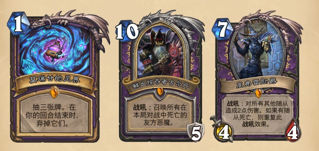 鲜血掠夺者古尔丹同样是一张强力的英雄牌,不过由于高额的费用和复活恶魔的联动效果,导致其主要出现在偏慢速的术士卡组中。众所周知,术士有着最为均衡的快慢两种形态,再加上即将退环境使得英雄牌合成的优先度有所降低。