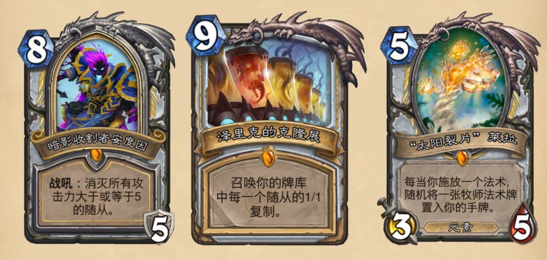 即便在拉兹退环境之后,暗影收割者安度因仍凭借着过硬的单卡质量出场,你几乎可以在任何牧师卡组中加入一张以提升卡组强度,对于缺乏进攻性的牧师卡组来说也是重要的制胜点,属于泛用性很强的卡牌。