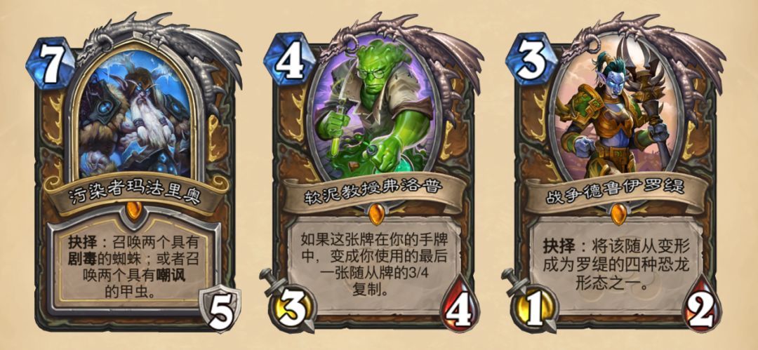 如果说还有什么值得德鲁伊骄傲的话,那也只剩下两大赖皮和英雄牌了。污染者玛法里奥强大的抗快攻能力使得他在以往的版本中总是出现在德鲁伊的卡组之中。