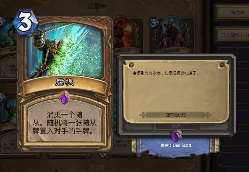不管从效果还是费用来说腐根都是一张非常OP的卡牌,3费的费用让我们基本可以在很多种情况下打出,同时还有很大的几率会有剩余的法力水晶,能在解场的回合完成站场,这些对节奏都非常重要。但缺点是会将一张随从牌给到对手,不过只要对方不是欧皇都能接受。