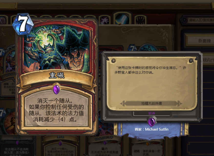 重碾在战士的卡组中表现不算非常出色,首先是费用太高,但若能触发条件看起来也算不错。但相对于“盾牌猛击”和“斩杀”这些低费的解牌就有点鸡肋了,而且战士还有乱斗这张神卡,很难再给重碾空一个位置出来。