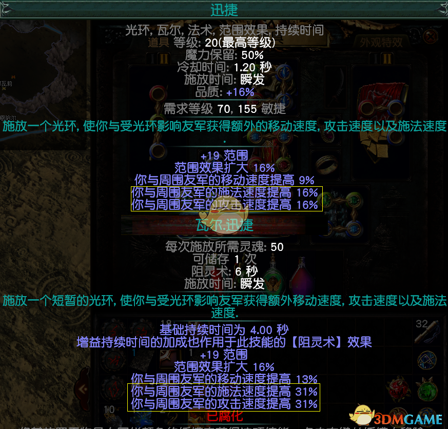 (迅捷提供16%的施法及攻击速度,瓦尔迅捷提供31%的施法及攻击速度,我们的天赋点了非诅咒类光环效果提升58%,和善提供了非诅咒类光环效果提升40%!而迅捷与瓦尔迅捷可以同时使用,这样就是(16%+31%)x158%+(16%+31%)x140%=140.06%的施法及攻击速度,当然这些你享受不到,因为有和善存在,只有召唤物能享受到光环加成。在这短短的几秒钟,你的魔侍就像注射了兴奋剂疯狂输出。你以为魔侍的攻速到极限了么?往下看。)